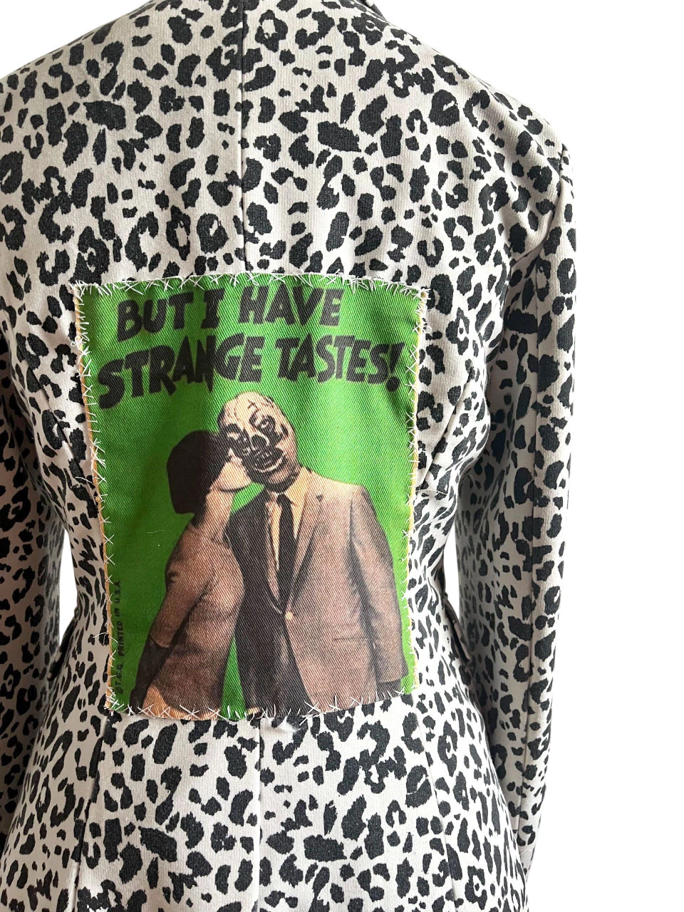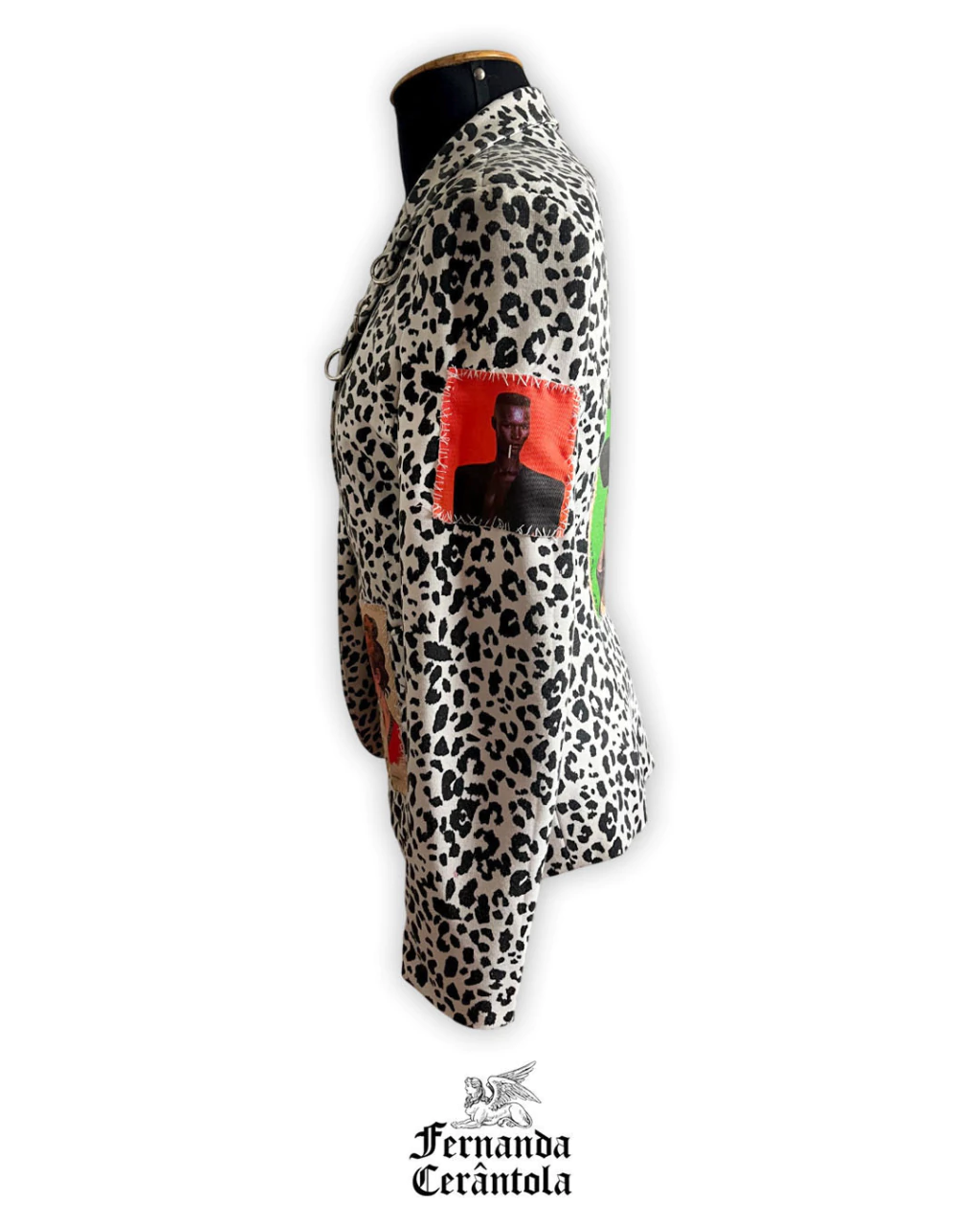Blazer de oncinha customizado com patches, referênciando Grace Jones, Vivienne Westwood e cartoons. Possui 3 ilhós na gola com argolas abre e fecha (que podem ser usadas para pendurar outros acessórios). Peça única e exclusiva.